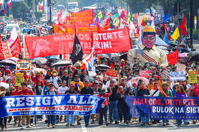 ‘NO MERCY’: Demonstrators demanded that members of the Philippine Congress, officials and company owners be prosecuted for stolen flood control project funds Thousands of demonstrators, including Catholic Church clergy, protested in the Philippines yesterday, calling for the swift prosecution of top legislators and officials implicated in a corruption scandal that has buffeted the Asian democracy.Left-wing groups led a separate protest in Manila’s main p